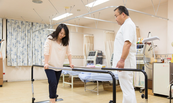 リハビリテーション科では、リハビリ機器を用いて運動機能や精神機能障害を回復させるための治療を行います。障害を持った患者様が早期回復、復帰ができるよう、無理のないリハビリ計画で援助いたします。