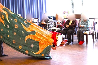 地域に古くから伝わる、国無形重要民俗文化財「田の神祭り」において奉納される獅子舞が、このたび訪問してくださいました。太鼓や笛の音色とともに力強く、そして華麗に舞い踊られ、フロアは一瞬にして祭りの空気に包まれました。獅子が登場すると 「立派やなあ」 「久しぶりに見たよ」といった声があちこちから聞こえ、皆様の表情がぱっと明るくなりました。間近で見る獅子の姿は迫力があり、軽やかに跳ねたりする様子に、思わず手を合わせて見入られる方もいらっしゃいました。