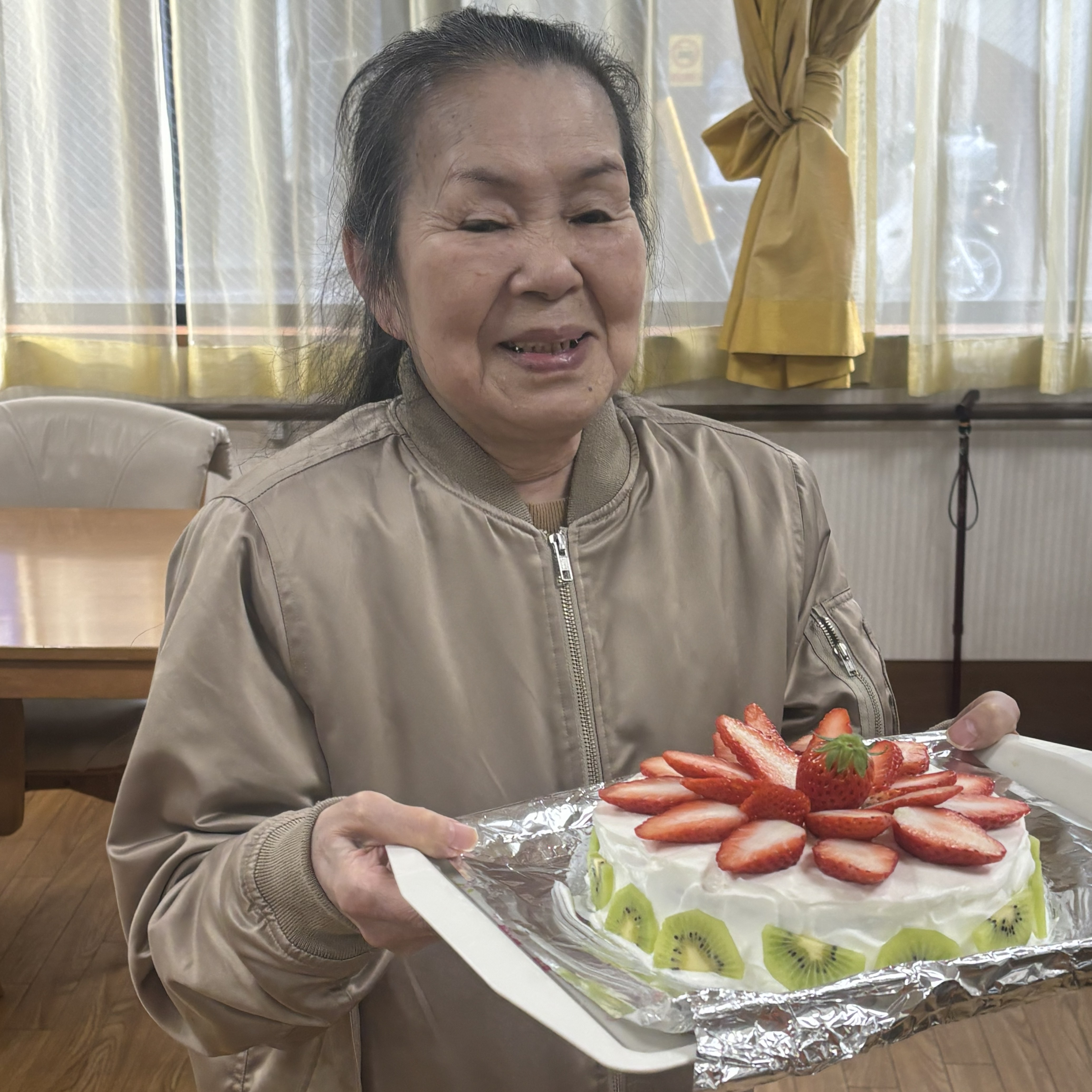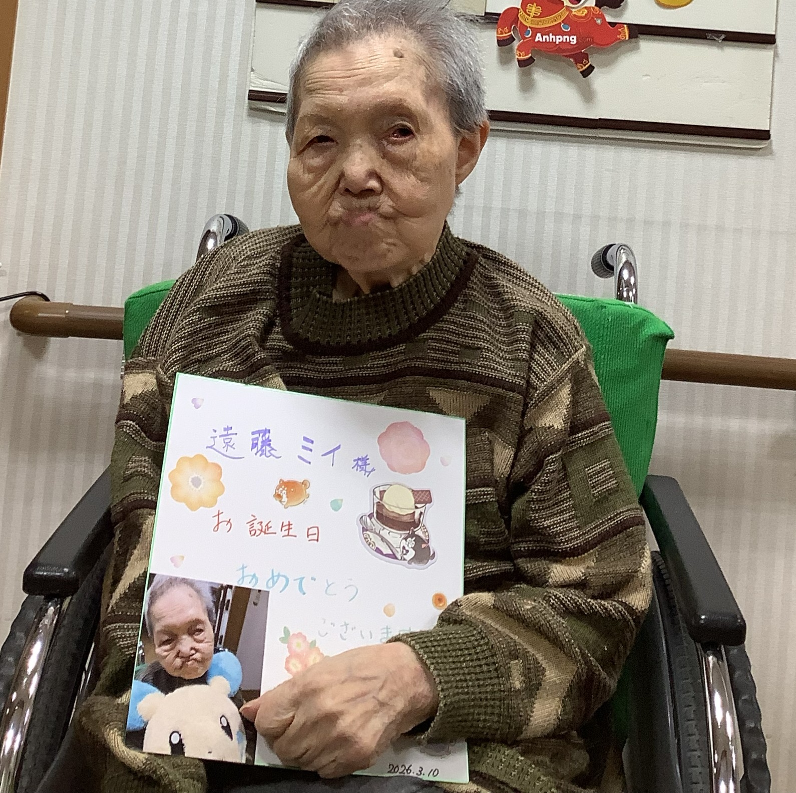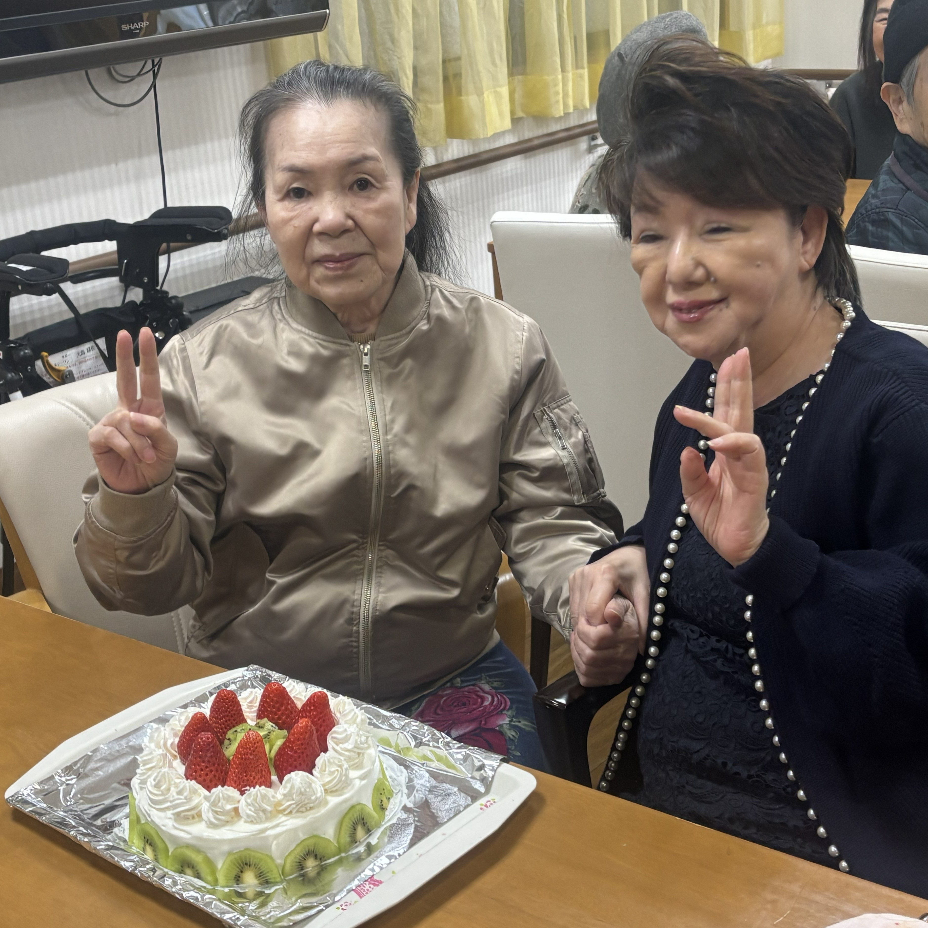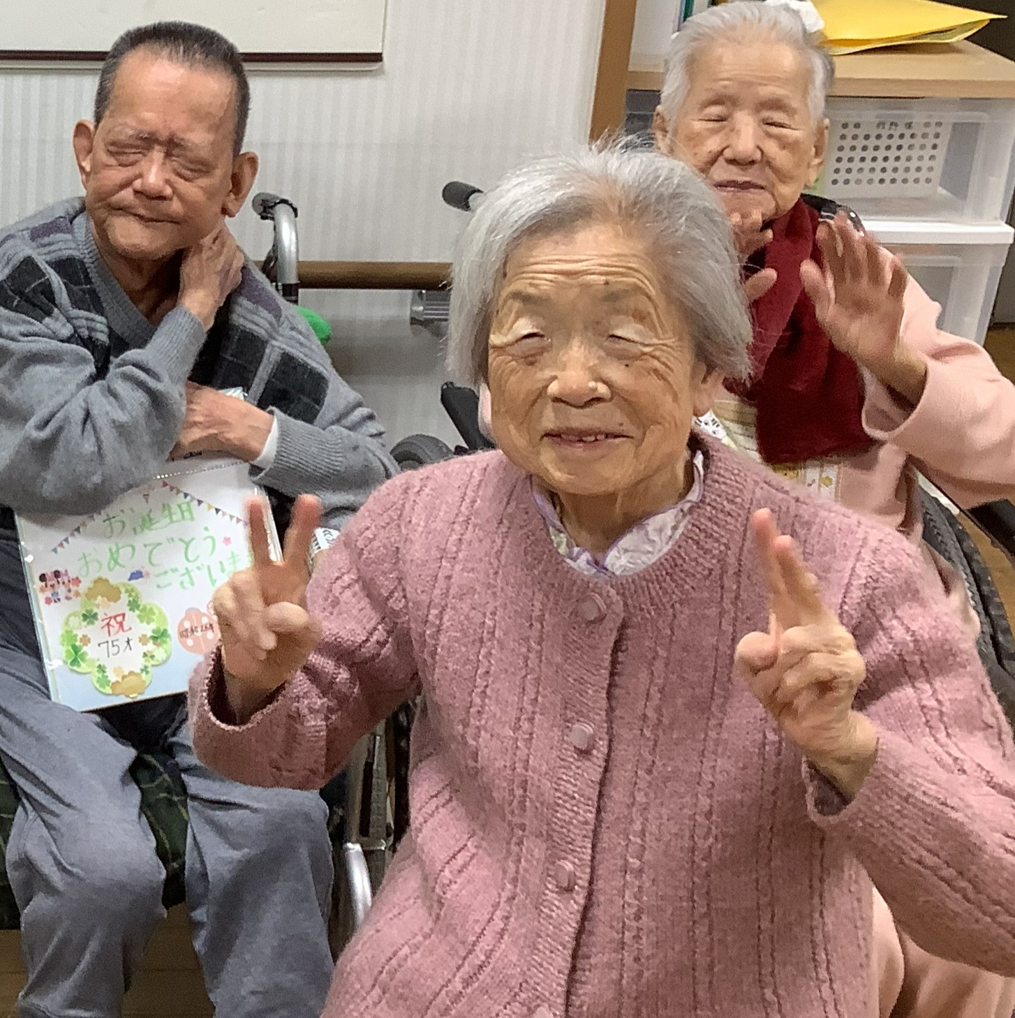 記念写真では、ピースサインを見せてくださる姿がとても印象的で、そのおちゃめで可愛らしい表情に、周囲も自然と笑顔に。年齢を重ねてもなお変わらない愛らしさに、職員も心が温かくなりました。