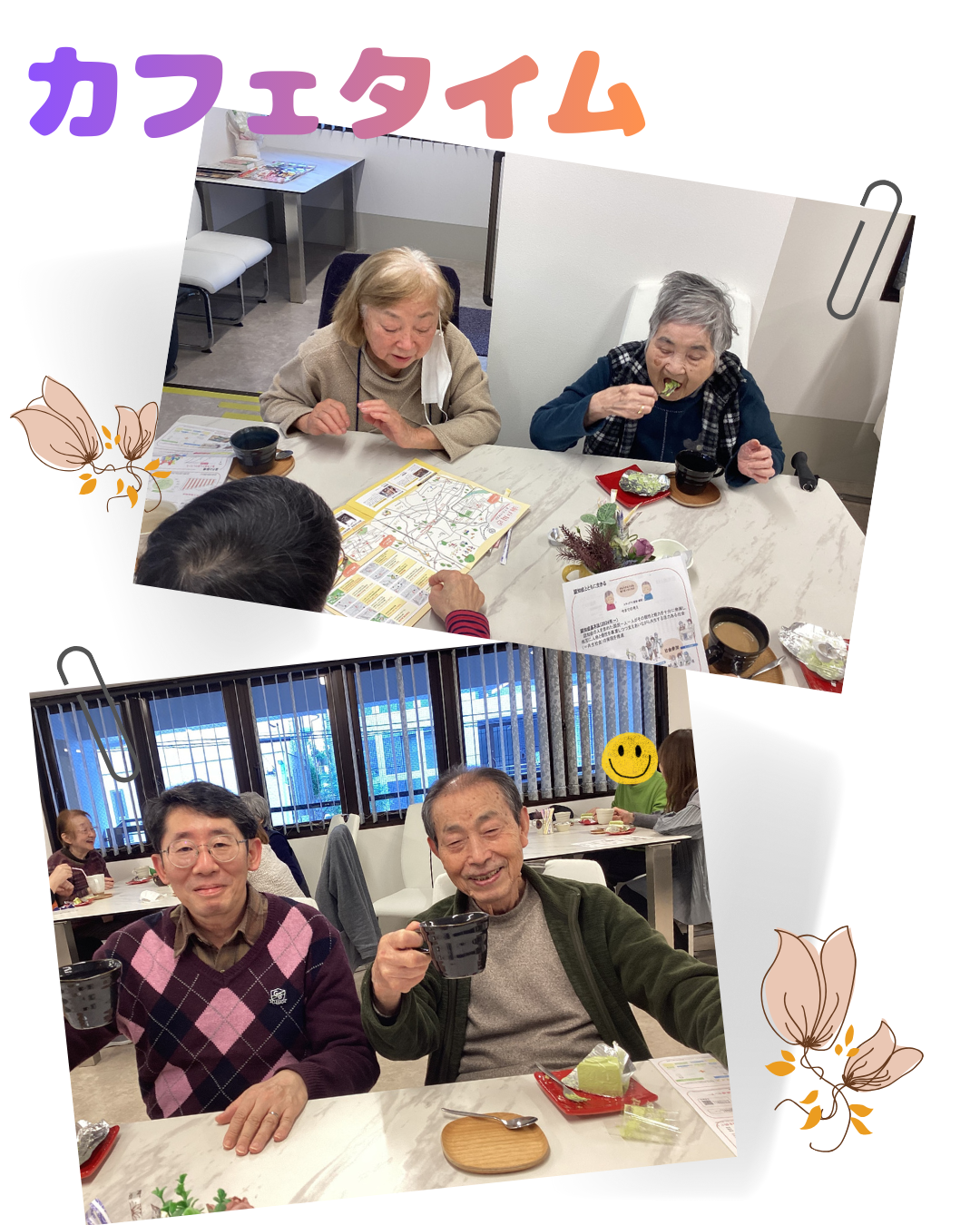 カフェタイムでは、みなさんで色々なお話をしてお飲み物とケーキを