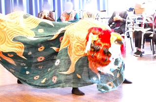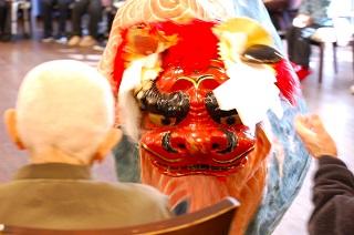 地域に古くから伝わる、国無形重要民俗文化財「田の神祭り」において奉納される獅子舞が、このたび訪問してくださいました。太鼓や笛の音色とともに力強く、そして華麗に舞い踊られ、フロアは一瞬にして祭りの空気に包まれました。獅子が登場すると 「立派やなあ」 「久しぶりに見たよ」といった声があちこちから聞こえ、皆様の表情がぱっと明るくなりました。間近で見る獅子の姿は迫力があり、軽やかに跳ねたりする様子に、思わず手を合わせて見入られる方もいらっしゃいました。