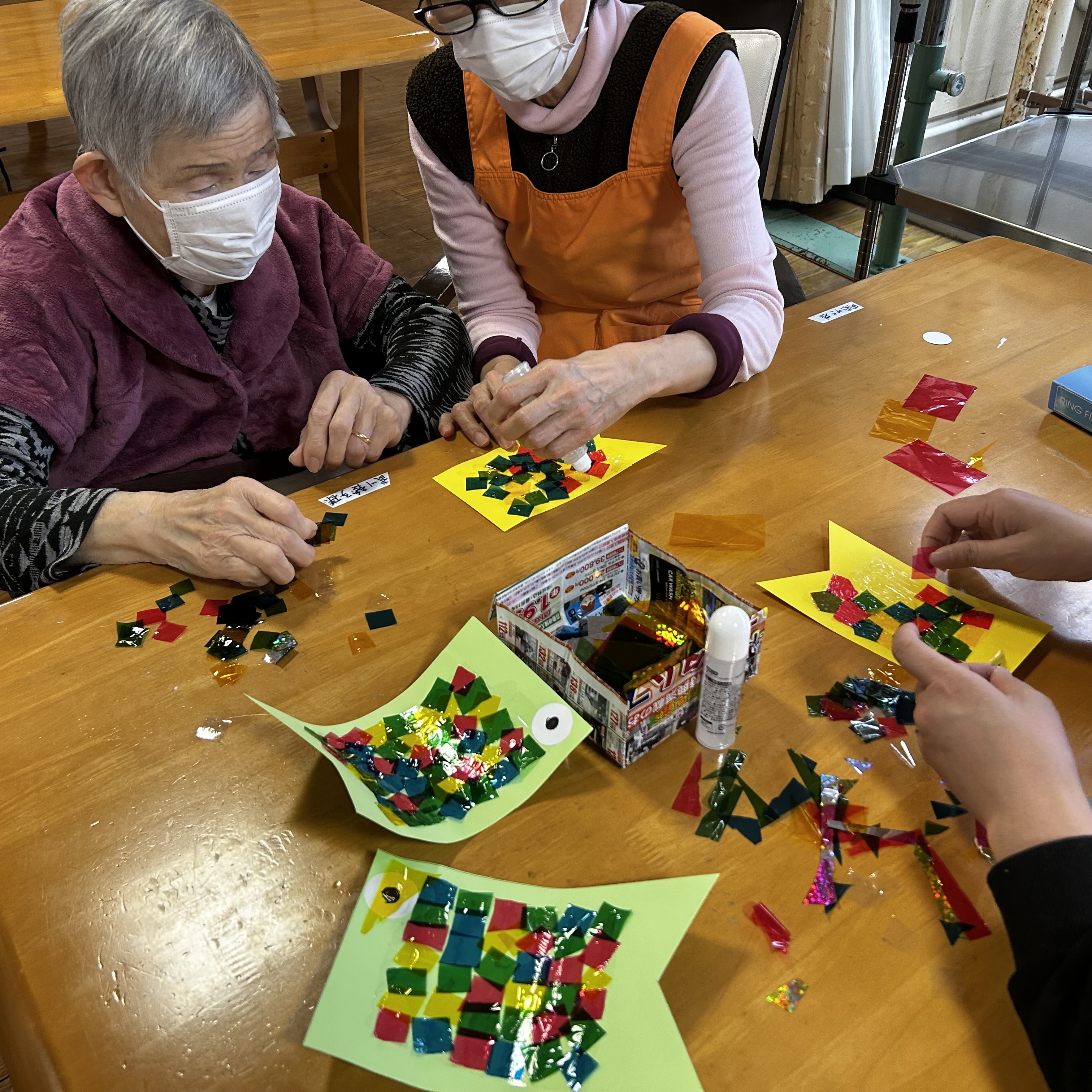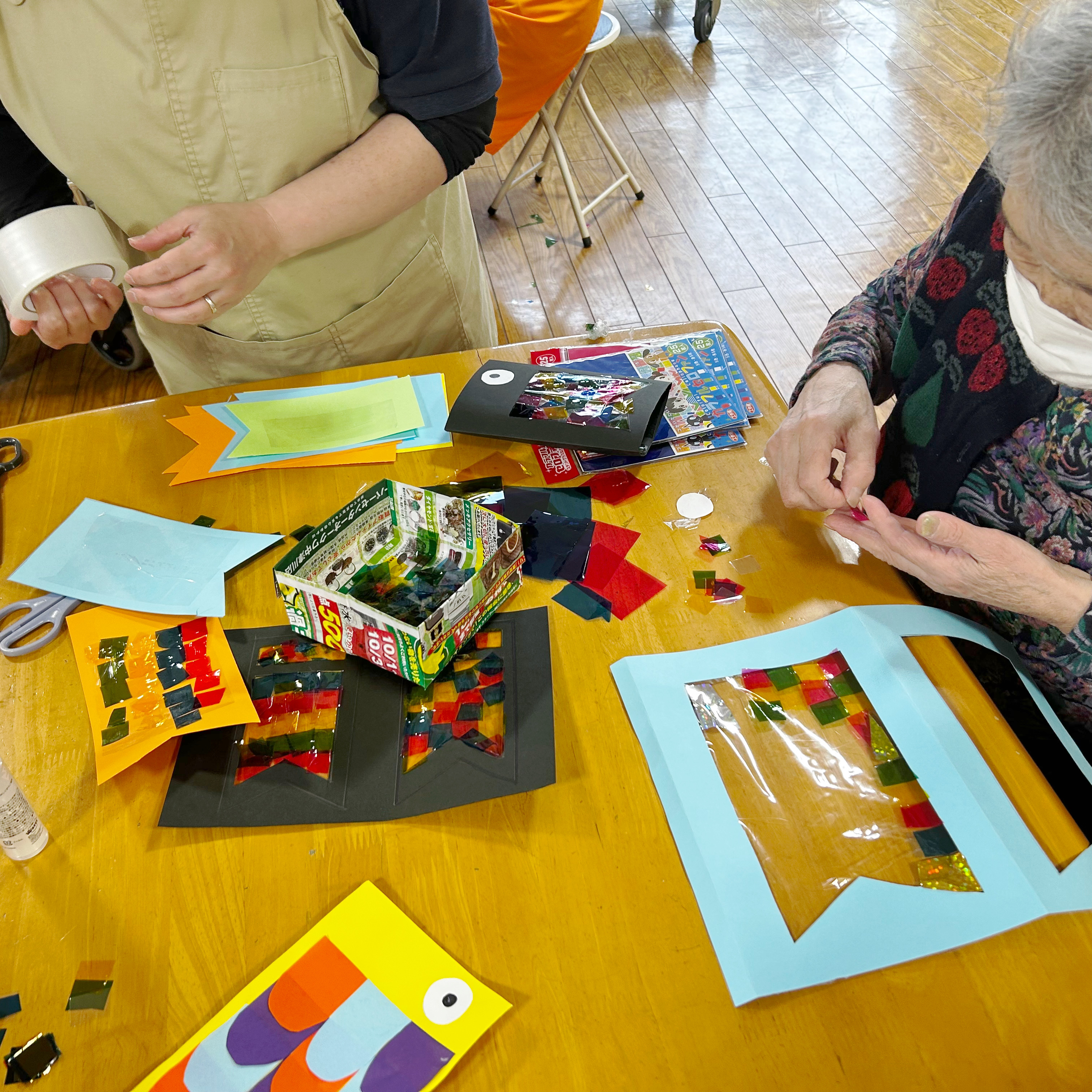 色々な色のセロハンを画用紙に貼ります。